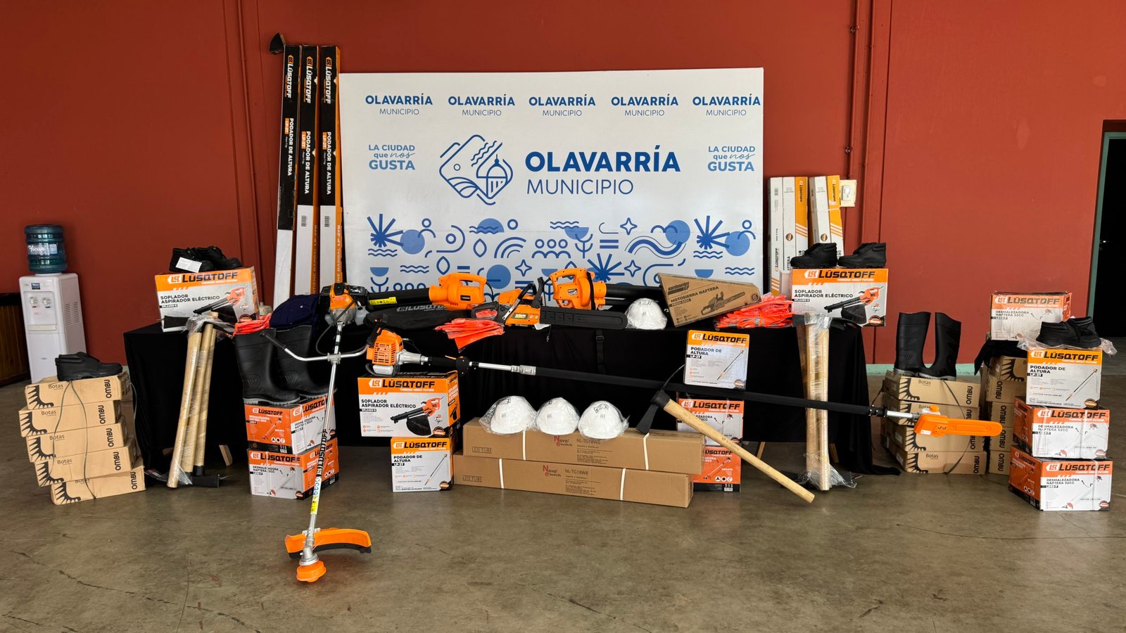 Durante la jornada se entregaron motosierras, podadoras de altura, desmalezadoras y sopladores de hojas, además de equipamiento de protección como botas de goma, botines de seguridad, cascos, lentes, chalecos refractarios y guantes. También se incluyeron tubos LED, picos y hachas reforzadas.