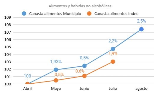 En lo que respecta a los precios de alimentos, el informe elaborado por el Municipio refleja un aumento promedio superior al 2,5% durante agosto, aunque con subas más pronunciadas en algunos rubros específicos. Banana, tomate y cebolla registraron incrementos por encima del 4%, mientras que en el caso de los lácteos los valores superaron el 6%, particularmente en el queso cremoso. Desde el área de Desarrollo Económico se remarcó que los aumentos de julio y agosto se produjeron tras una fuerte suba del dólar y el alza de las tasas de interés, en un marco de volatilidad e incertidumbre empresarial a raíz de medidas adoptadas por el Gobierno nacional.